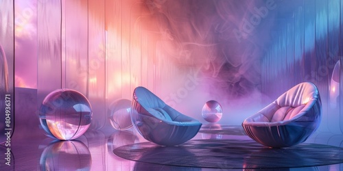 A couple of chairs are placed neatly on top of a table. The chairs are empty, with no one sitting on them. The setting is simple and minimalistic, with a background design wallpaper