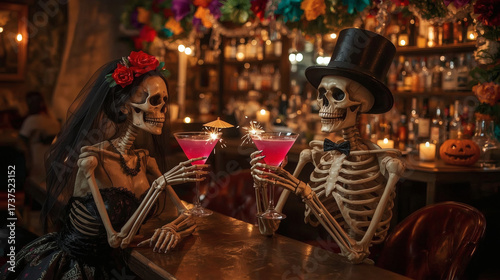A couple of skeleton lovers with cocktails at the bar. A party in honor of Halloween or the Day of the Dead.