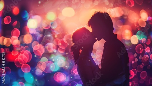 A couple sharing a romantic kiss with a bokeh of twinkling city lights in the background, advertising a Valentine's Day date night, Free space for text Valentine's Day concept