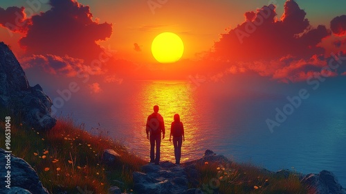 A couple stands hand in hand, admiring a breathtaking sunset over the ocean, with vibrant colors and dramatic clouds.