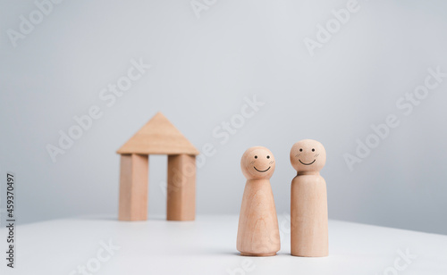 A couple starts a life together with the property real estate investment concept. The happy face wooden human couple standing in front of a wood house miniature on white background, minimal style.