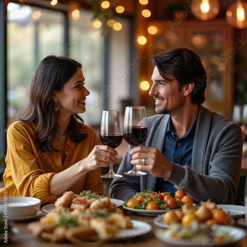 A couple toasts with glasses of red wine at a cozy restaurant table filled with delicious food. Perfect for promotions related to dining, romantic evenings, and culinary experiences, copy space