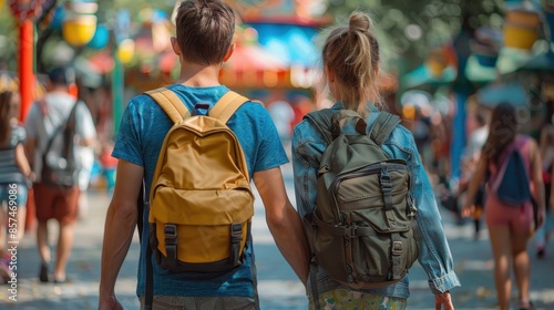 couple, amusement park, colourful, attraction, people, excitement, connection, walk, bustling, tied-up, enjoyment, urban life, bond, human relationships, fun, exploration, adventure, bright, festival, happiness, oneness, outing, high-coloured, community, love, backview, youth, togetherness, entertainment, carefree, life events, joy, casual attire, memory