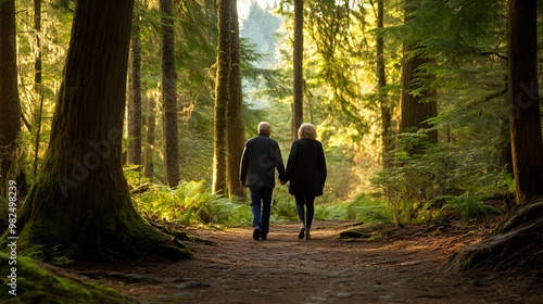 A couple walks hand in hand through a peaceful forest, surrounded by trees and natural beauty, enjoying a serene moment together.