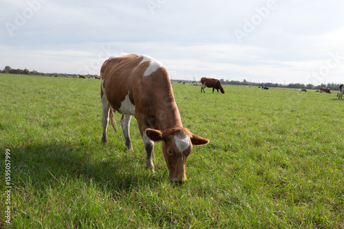A cow grazes on fresh pasture. Natural grazing of cows.