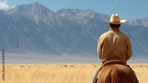 A cowboy skillfully guides his horse through a golden grassy field where a herd of cattle grazes, with majestic mountains rising in the background under a clear blue sky