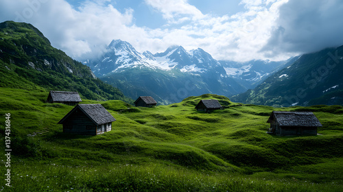 A cozy alpine hut with a small wooden deck, surrounded by blooming flowers and a stunning view of the valley below.