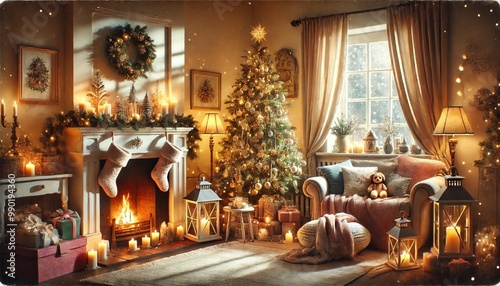 A Cozy and Gentle Christmas Scene Inside a Warmly Lit Living Room, Filled with Soft Light and Joyful Decorations
