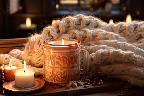 A cozy and hygge-inspired Christmas background with blankets, hot cocoa, and warm lights.