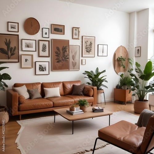 A cozy and stylish living room with a brown leather sofa, wooden coffee tables, and a gallery wall with various framed artwork.