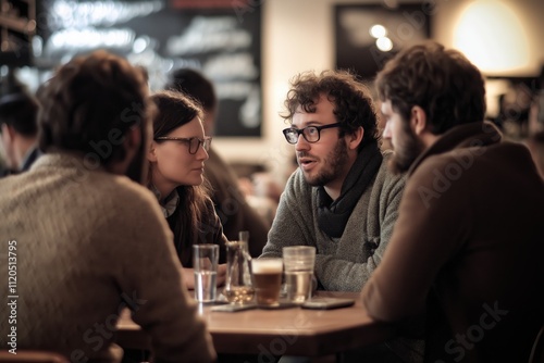 A cozy atmosphere featuring friends engaged in a lively conversation at a café.