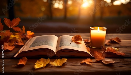 A cozy autumn evening with a book on a wooden table surrounded by leaves and a flickering candle. Generative AI