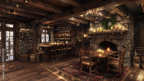 A cozy cabin-style dining room with a stone fireplace, log furniture, and warm, earthy tones throughout the decor.