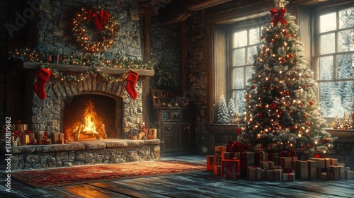 A cozy Christmas living room featuring a decorated tree, gifts, a roaring fireplace, and festive decorations, creating a warm holiday atmosphere.
