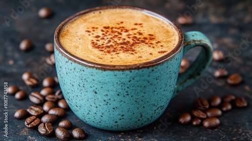 hot drink, cup, mug, bean, dark, roasted, hot, drink, beverage, caffeine, espresso, cappuccino, mocha, latte, breakfast, morning, aroma, steam, teal, blue, brown, texture, food, delicious, energy, warmth, comfort, spice, cocoa, powder, rustic, background, table, surface, closeup, top, view, single, 1, detail, grain, ground, rich