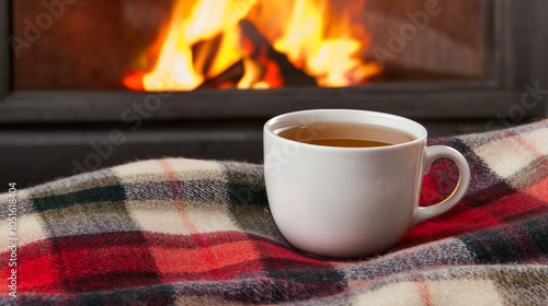 A cozy cup of tea sits on a soft, plaid blanket in front of a warm, crackling fire, evoking comfort and relaxation.