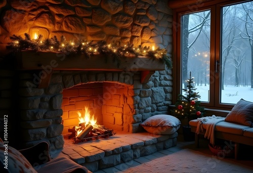 A cozy fireplace with a mantel decorated with Christmas ornaments and candles, in front of a snowy winter landscape visible through a window, a christmas present near the fireplace