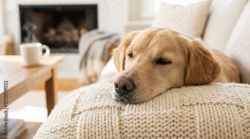 A cozy golden retriever rests peacefully on a knitted blanket in a warm, inviting living room setting.