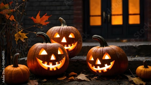 A cozy Halloween scene featuring glowing orange pumpkins, flickering candles, and autumn leaves scattered across a wooden porch. Warm light casts soft shadows, enhancing the rustic textures
