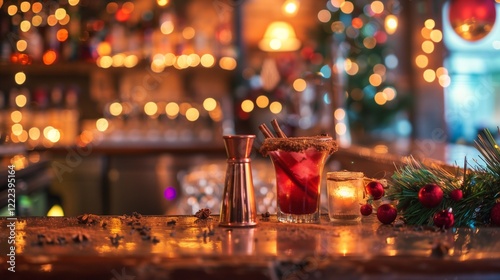 A cozy holiday-themed bar with warm spiced cocktails, cinnamon sticks, and twinkling Christmas lights 4