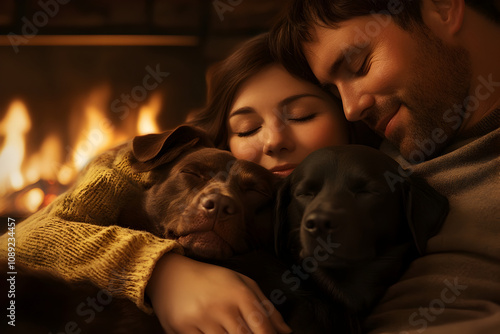family, pet, fireplace, cosy, warmth, holiday season, snuggling, cuddling, togetherness, love, comfort, indoor, home, festive, holiday, hearth, winter, relaxation, christmas, joy, family time, together, happiness, fire, seasonal, intimate, festive season