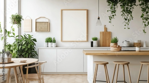 A cozy kitchen corner with a frame mockup on a clean wall, styled with Scandinavian aesthetics, including wooden elements and greenery.