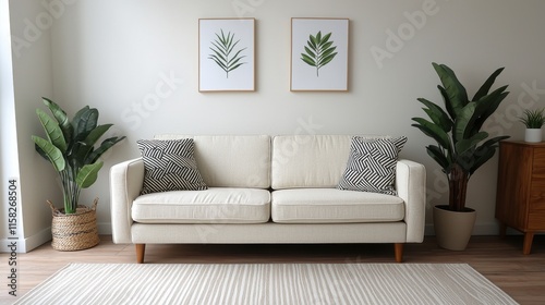 A cozy living room featuring a light-colored sofa, decorative pillows, potted plants, and framed leaf artwork on the wall.