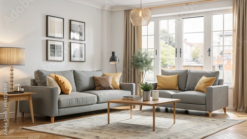 A cozy living room with a comfortable sofa, a stylish coffee table, and a soft rug.