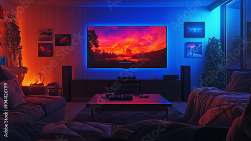A cozy living room with a large TV screen