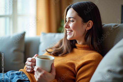 A Cozy Moment: A Young Woman Enjoying Coffee While Relaxing on a Sofa in a Warm, Bright Living Space During a Sunny Day