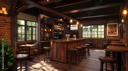 A cozy pub setting with warm wood tones and 3D-rendered locally brewed craft beers served with gourmet wings
