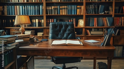 A cozy study featuring a wooden desk, leather chair, and bookshelves filled with classic literature and warm lighting.