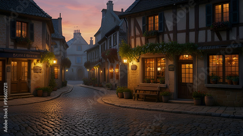 A cozy village square at dawn, with cobblestone streets, street lamps flickering out, and the first shopkeepers opening their doors. Background