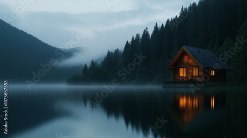 A cozy wooden cabin glows warmly by a misty lake, surrounded by dense pine forests, creating a serene and secluded retreat in nature.