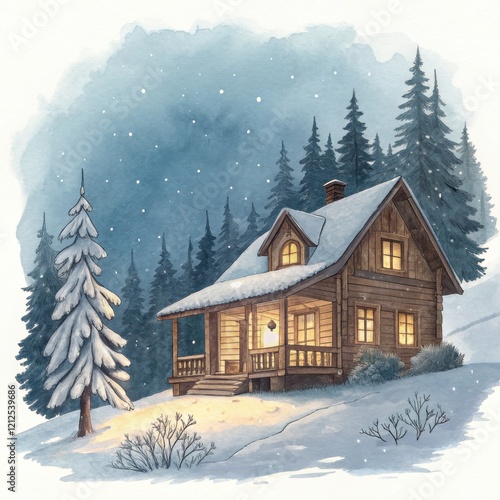 A cozy wooden cabin is nestled in a snowy landscape, surrounded by tall evergreen trees under a gentle snowfall, creating a tranquil winter scene.