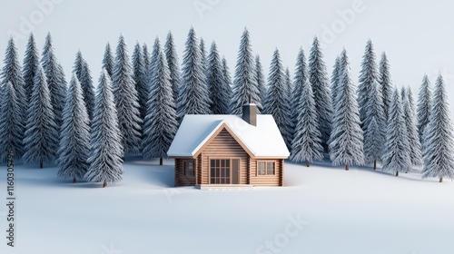 A cozy wooden cabin surrounded by snow-covered pine trees in a serene winter landscape.