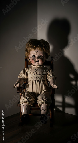"A cracked, antique porcelain doll, missing an eye, sitting on a rocking chair in a dark corner. The ambient light is minimal, and the doll's shadow on the wall appears distorted and larger than life,