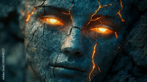 A cracked stone statue of a human face with glowing eyes and fissures emitting an eerie light, symbolizing inner turmoil, hidden power, and the concept of awakening or resurrection