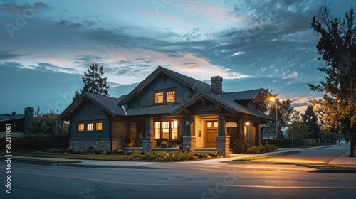 A Craftsman style house stands under the soft light of dawn in a suburban setting, suburban streets empty, suburban atmosphere quiet, enhancing the tranquil scene.