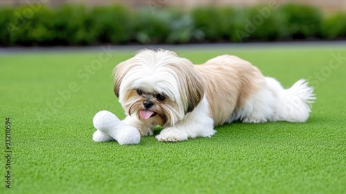 A cream Shih Tzu dog is happily playing with its toy while lying on the soft green grass in a sunny backyard