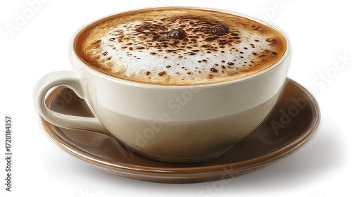 A creamy beverage in a ceramic cup atop a saucer, boasting a frothy, textured top with cocoa dusting