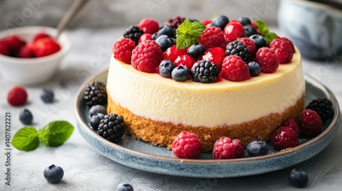 A creamy cheesecake topped with an assortment of fresh berries, including raspberries, blueberries, and blackberries, served on a gray plate.
