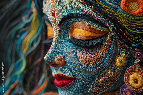 texture, thread, art, portrait, face, embroidery, colourful, stitched, threaded, design, pattern, craft, closeup, eye, detail, expression, skin, hand-made, artistic, blue, orange, red, yellow, green, bead, jewellery, head, decorative, abstract, macro, close, sew, eyelash, eyebrow, nose, lip, ornament, elegant, vibrant, braid, hair, style, sideview, imagination, creative, embellishment, intricate, fantasy