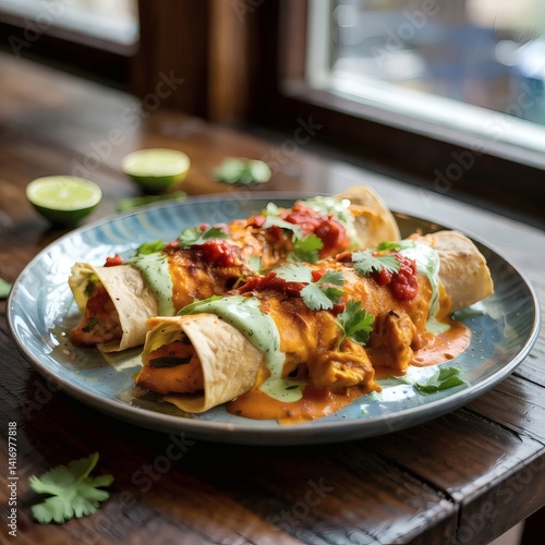 A creative fusion dish combining elements of Indian and Mexican cuisines: tandoori chicken enchiladas with vibrant chutney drizzles on a modern plate.