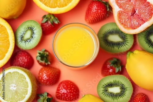 A creative layout featuring a glass of orange juice surrounded by vitamin C-rich fruits like kiwis, strawberries, and grapefruits, emphasizing the health benefits.