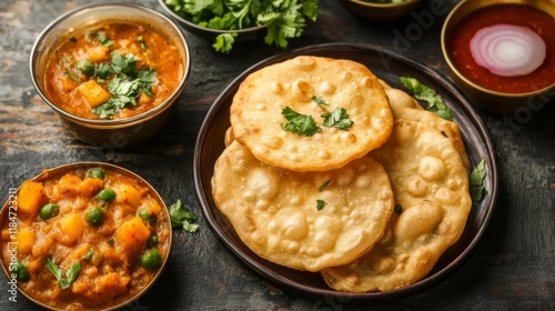 A creative shot of poori served with a vibrant vegetable curry, garnished with fresh herbs and placed on a textured surface for a rustic feel.
