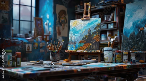 A creative workspace with various art supplies, including paints, brushes, and canvases