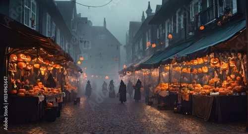 creepy, skittish, street market, eerie, stall, shadow, ghostly, fog, mist, dark, broken, abandoned, spider's web, skeleton, pumpkin, bat, sorcerer, sinister, old, tattered, rust-eaten, strange, mysterious, moonlight, haunted, overgrown, twisted, chilling, dusty, black cat, silent, foggy, ominous