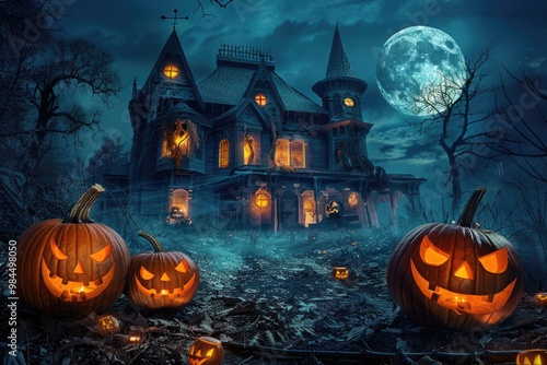 A Creepy Haunted House with Lit Jack-O-Lanterns Under a Full Moon