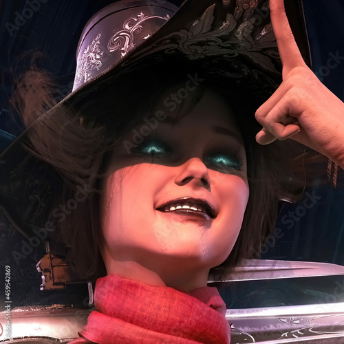 sinister, girl, sorcerer, vampire, daemon, green, eye, cheerful, smile, horror, sword, hat, finger, playful, intimidating, fairy tale, fantasy, portrait, face, lip, nose, look, eyelash, make-up, charming, cute, young, woman, female, hair, attractive, beauty, devil, evil, scarey, satan, game, power, stylised, hero, warrior, self-assured, feature, face, sharp, chin, scar, halloween